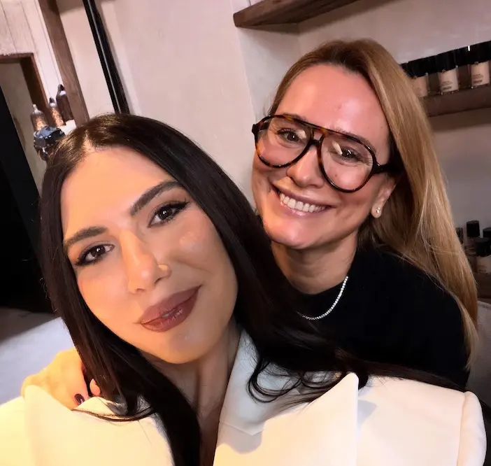 În imagine, Andreea Esca este surprinsă alături de cântăreața Sore, amândouă zâmbitoare, într-un cadru cald și primitor. Sore îmbracă un sacou deschis la culoare, având părul lung și închis, cu un machiaj discret și un aer elegant. Andreea, purtând ochelari cu rame groase și o ținută în nuanțe închise, emană o stare de bine și naturalețe.