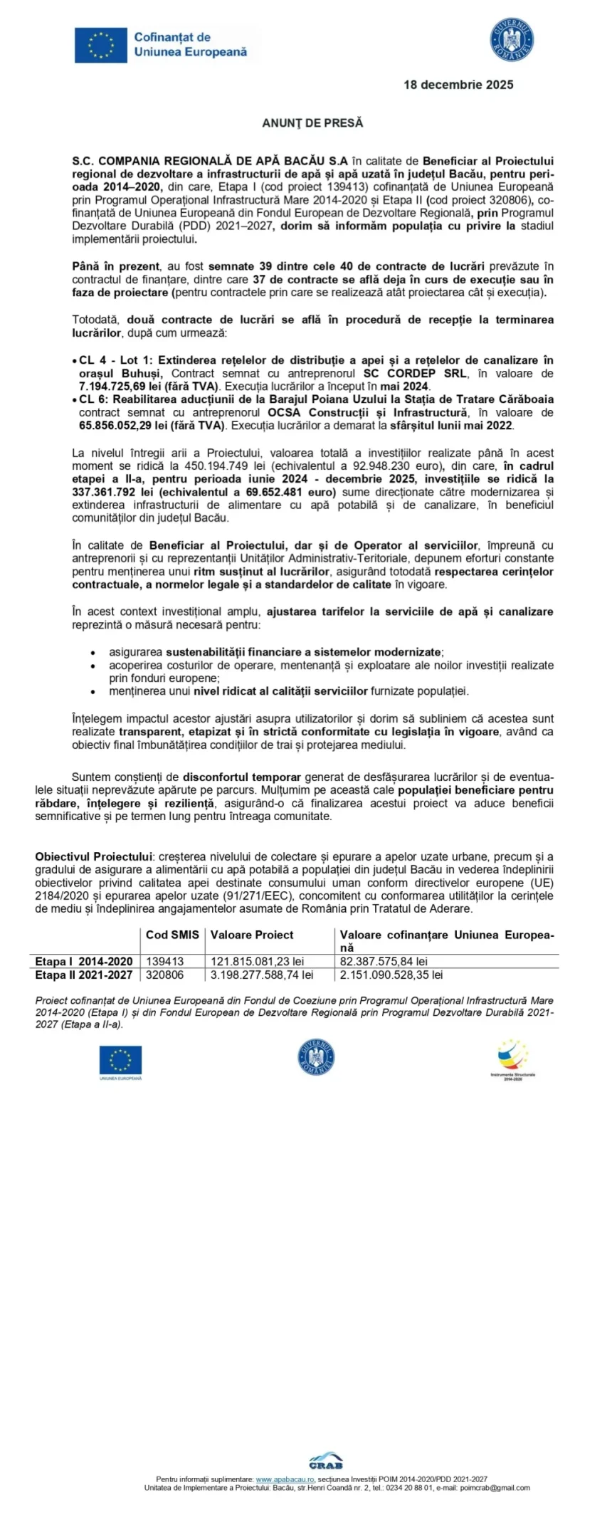 Reading: ANUNŢ DE PRESĂ S.C. COMPANIA REGIONALĂ DE APĂ BACĂU S.A