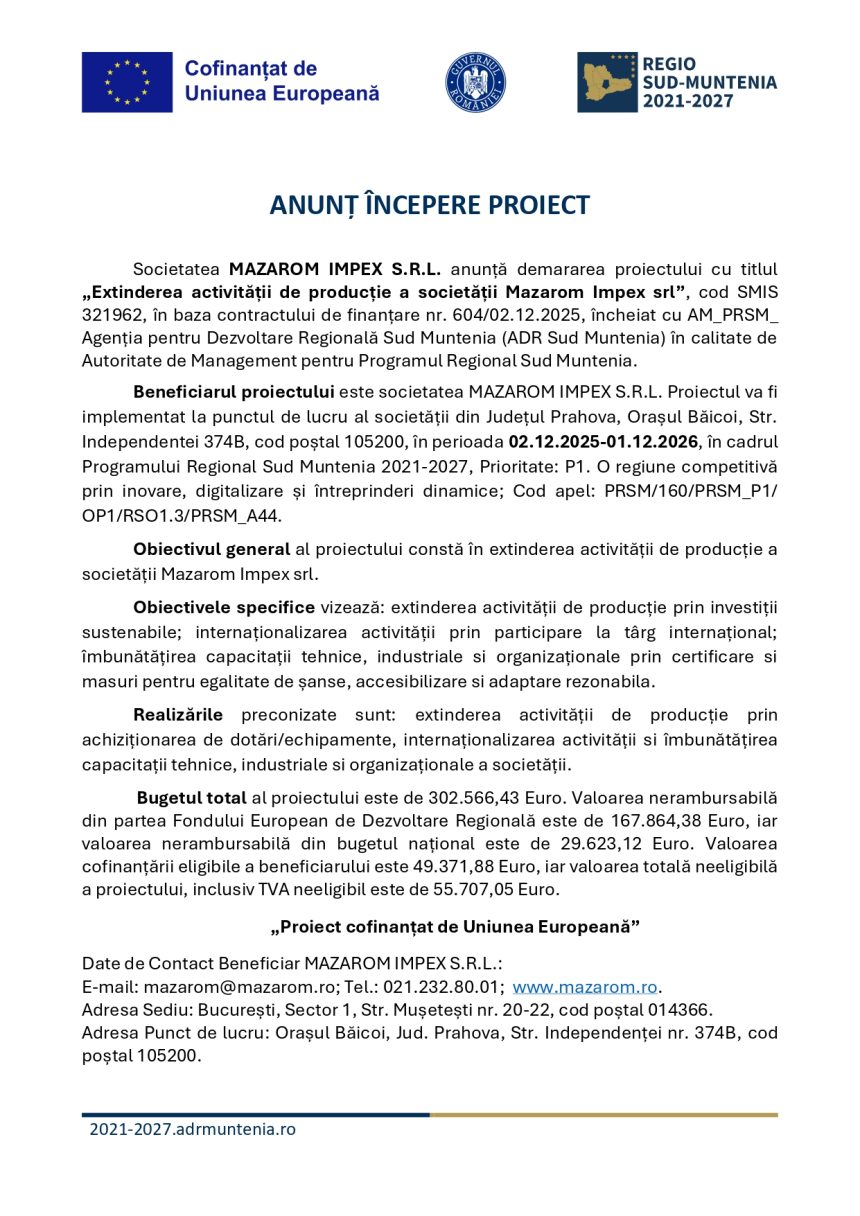 ANUNȚ ÎNCEPERE PROIECT MAZAROM IMPEX S.R.L.