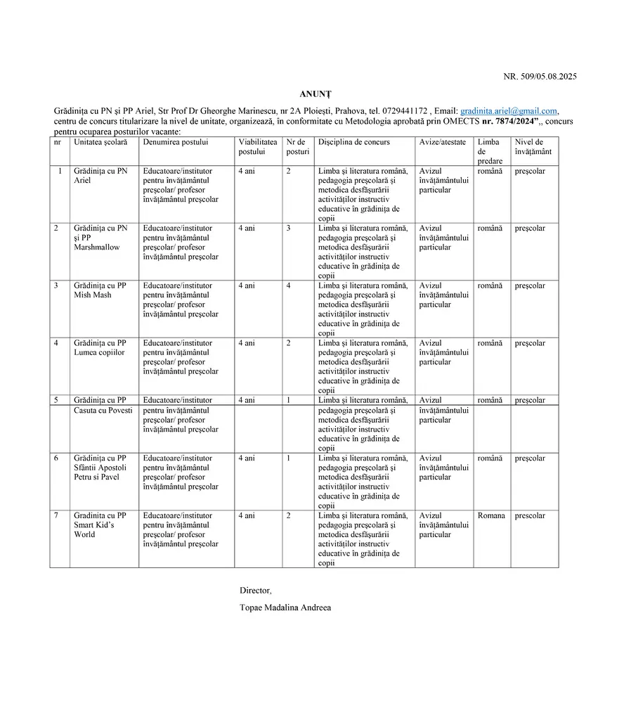 Anunț oferte serviciu GRĂDINIȚA CU PROGRAM NORMAL ȘI PROGRAM PRELUNGIT ARIEL