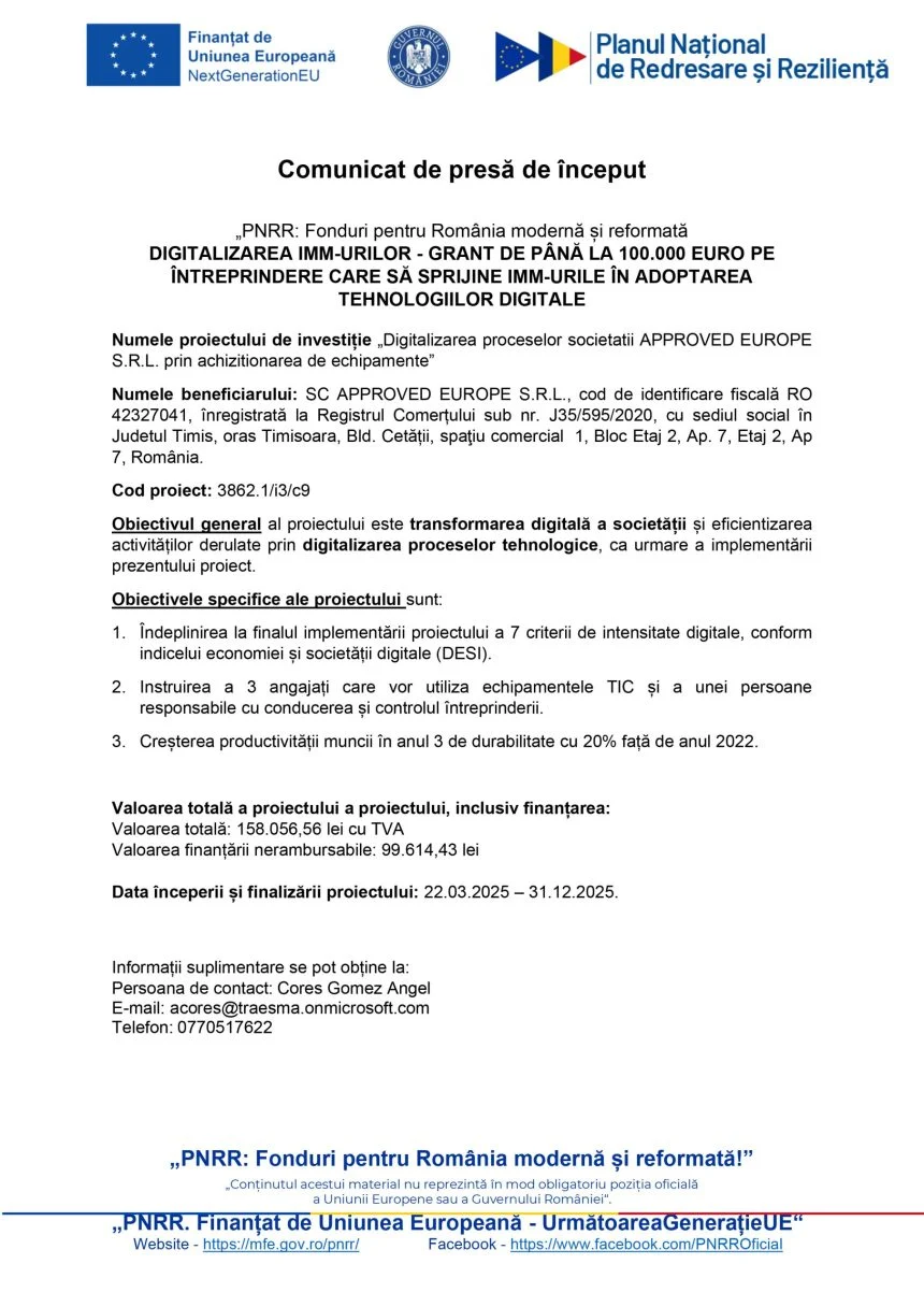 Comunicat de presă APPROVED EUROPE S.R.L.