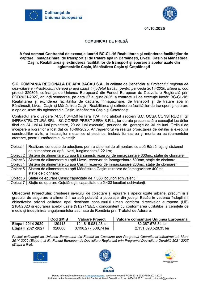 Comunicat de presă COMPANIA REGIONALĂ DE APĂ BACĂU SA (2)