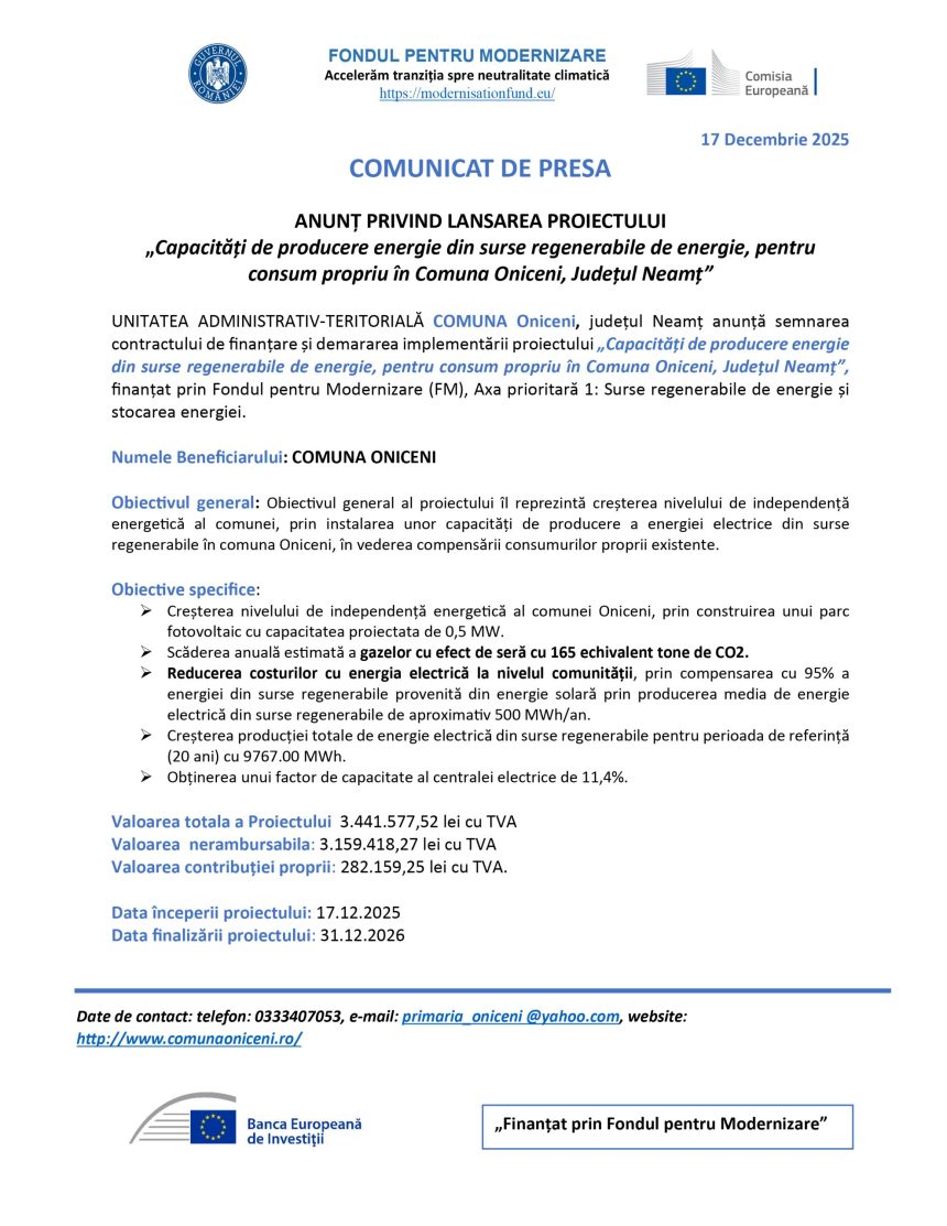 Observator Zilei > Anunțuri > Comunicat de presă Comuna Oniceni