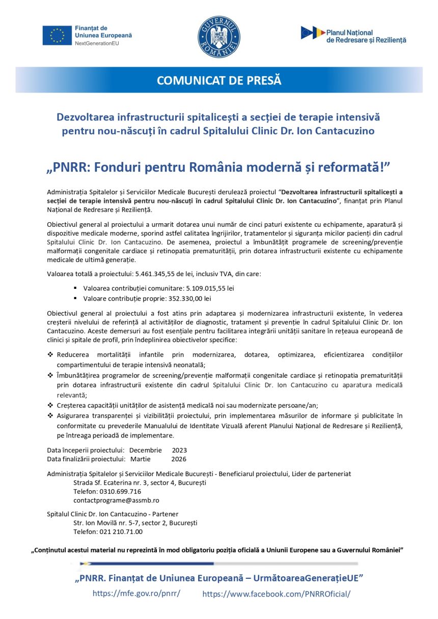 Comunicat de presă Dezvoltarea infrastructurii spitalicești a secției de terapie intensivăpentru nou-născuți în cadrul Spitalului Clinic Dr. Ion Cantacuzino