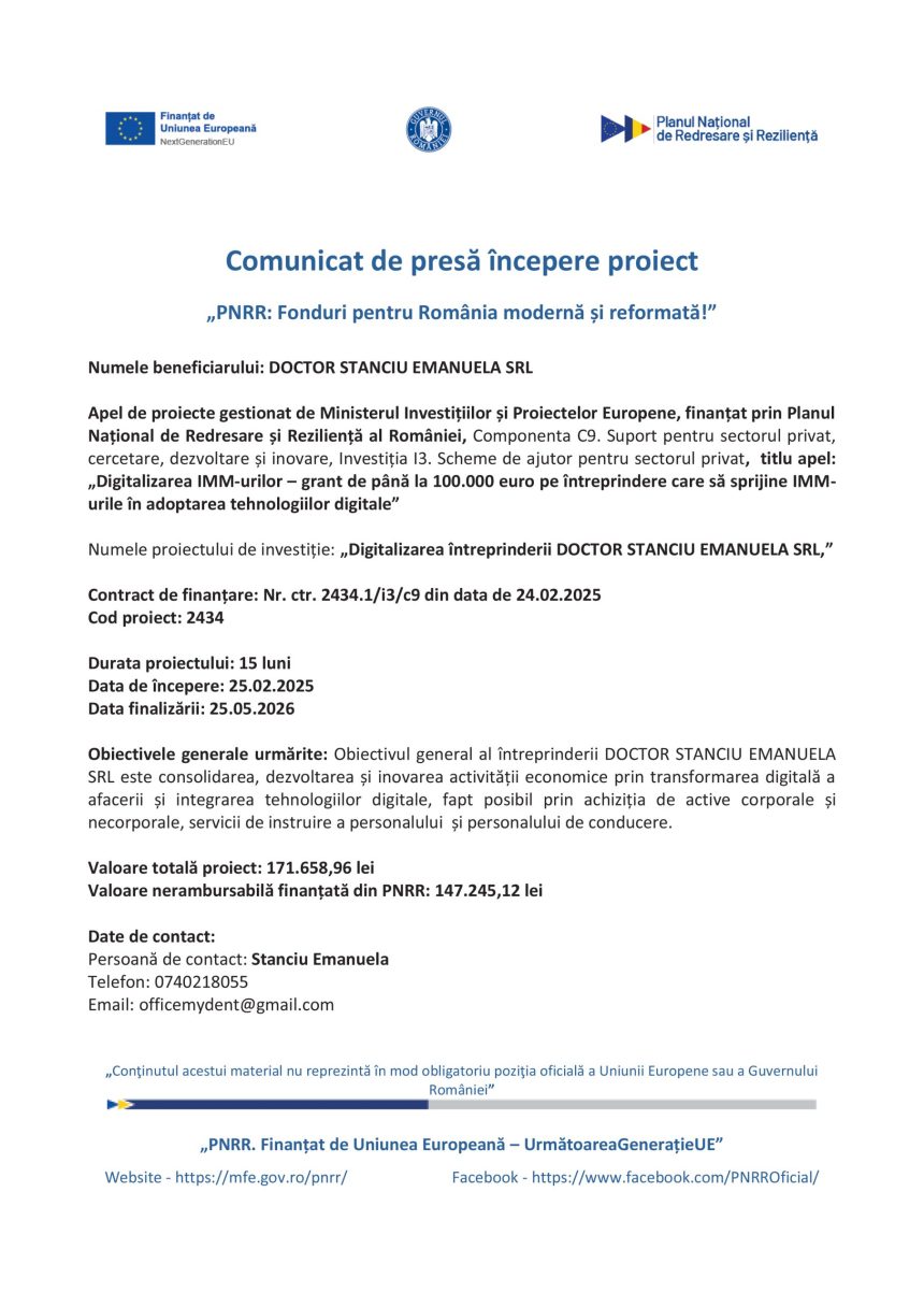 Comunicat de presă DOCTOR STANCIU EMANUELA SRL