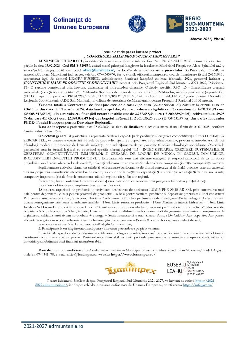 Comunicat de presă LUMIMPEX SEBCAR SRL