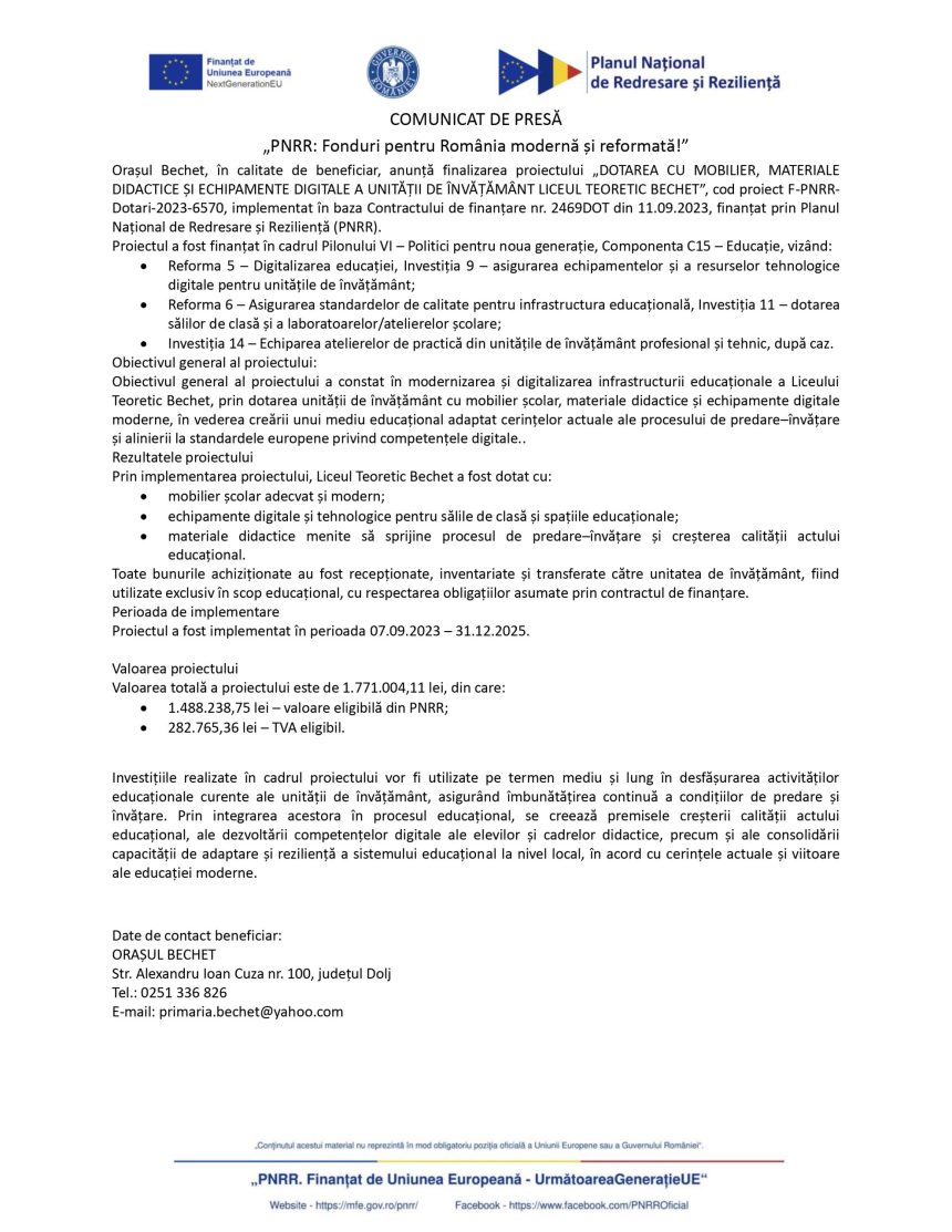 Observator Zilei > Anunțuri > Comunicat de presă Orașul Bechet