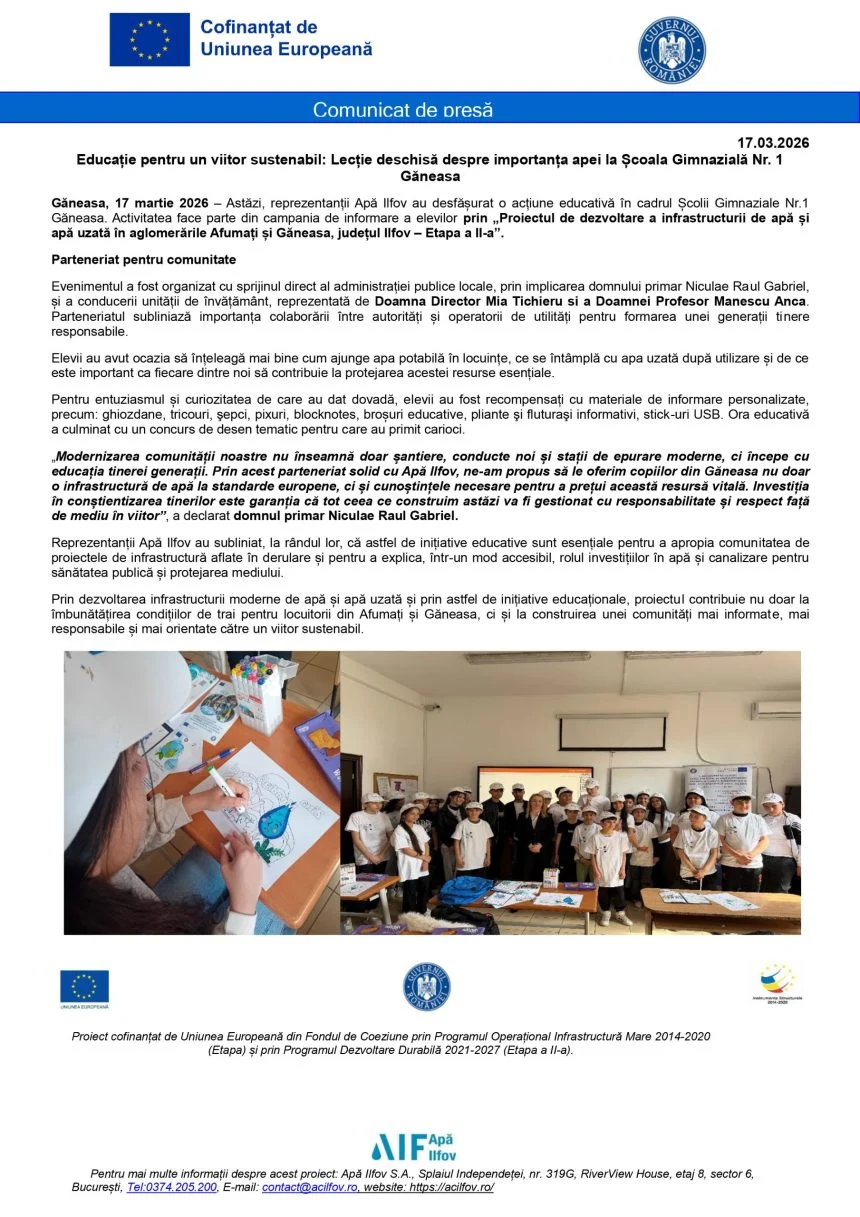 Comunicat de presa Scoala Gimnaziala Nr. 1 Ganeasa Școala Gimnazială Nr. 1 Găneasa
