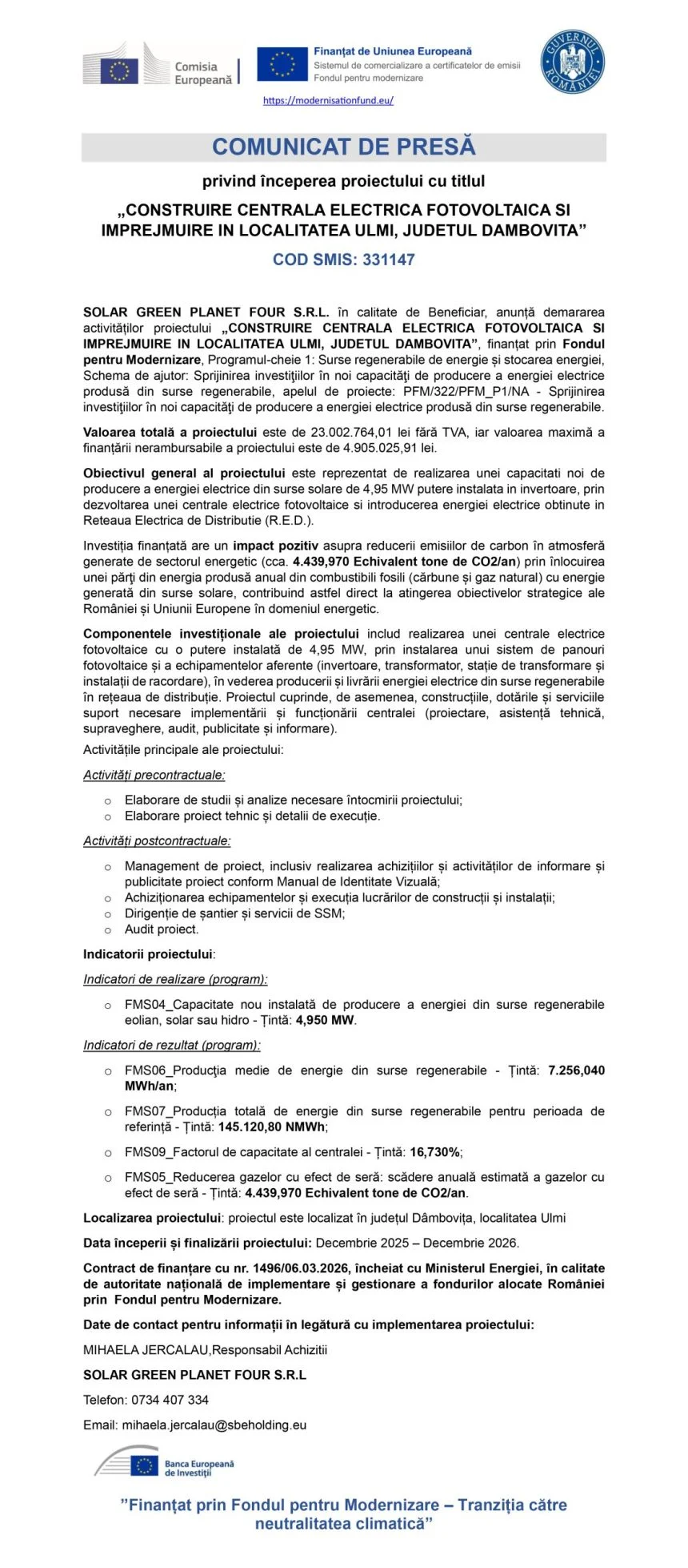 Comunicat de presă SOLAR GREEN PLANET FOUR S.R.L.