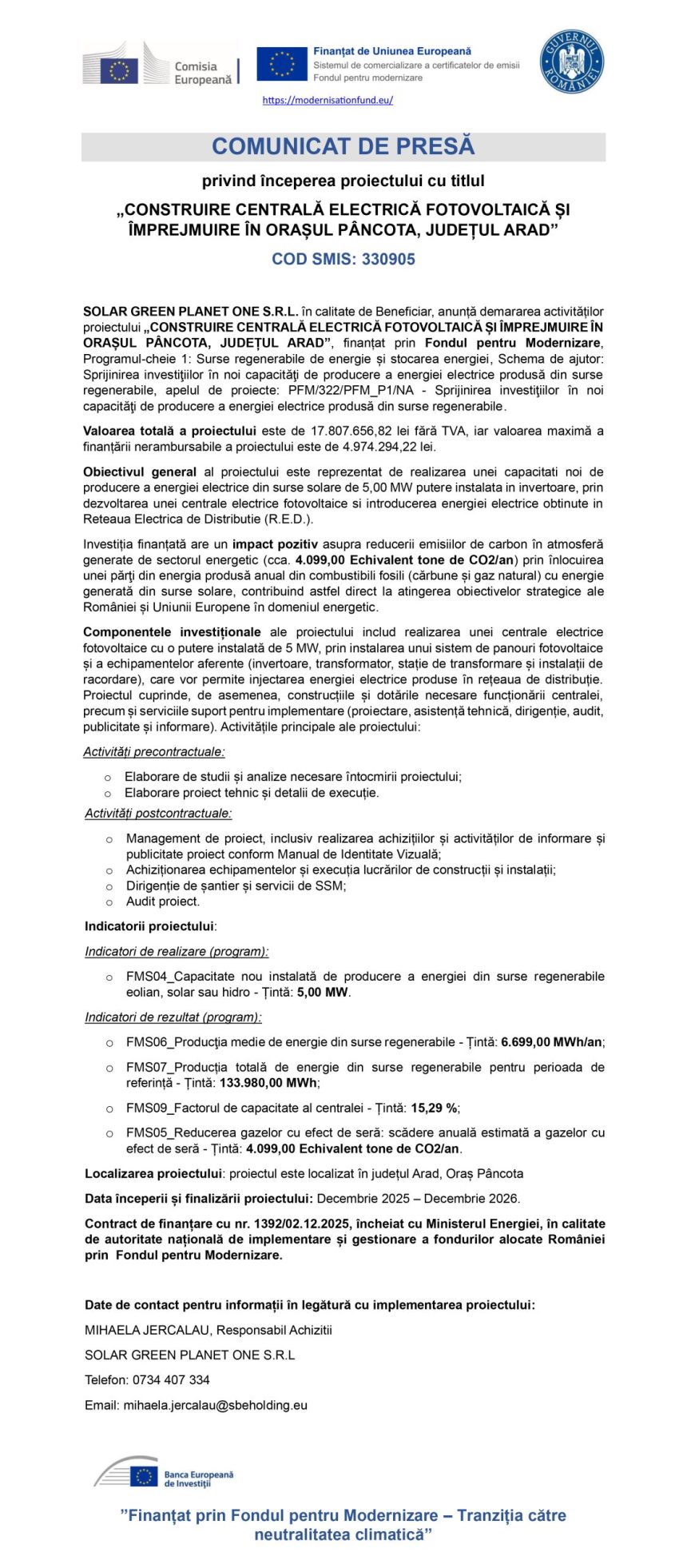 Comunicat de presă SOLAR GREEN PLANET ONE SRL