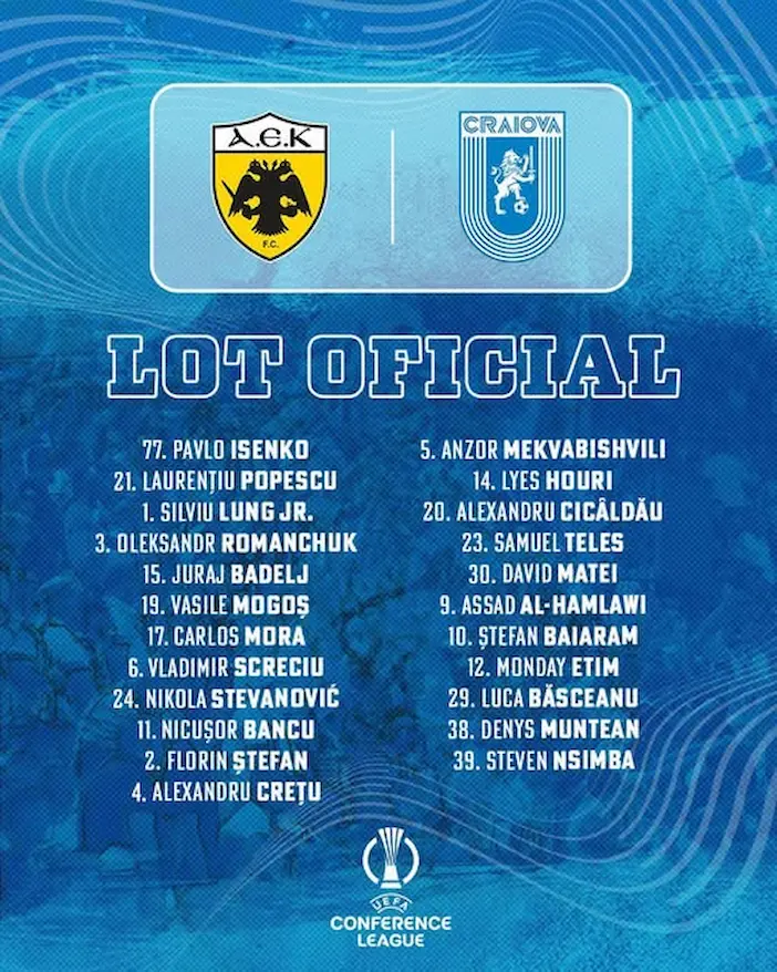 Lotul Universității Craiova pentru meciul cu AEK Atena